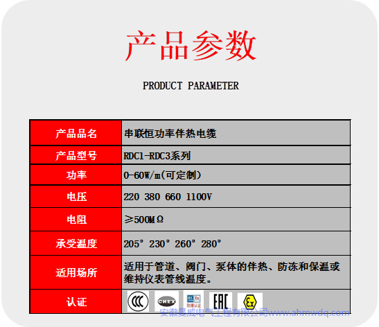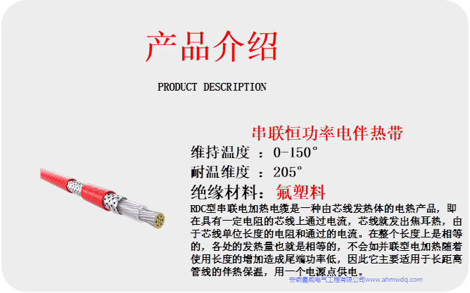 串聯(lián)恒功率電伴熱帶(RDC)產(chǎn)品名稱:串聯(lián)恒功率電熱帶型 號(hào):RDC產(chǎn)品規(guī)格:3-7mm2溫度范圍:0-150℃耐溫溫度:205℃ 250℃標(biāo)準(zhǔn)功率:0-60W/M具體可定制常用電壓:220 3