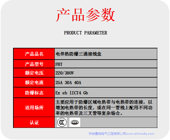 防爆三通接線盒(俗稱T型接線盒)。它主要應用于防爆區域電熱帶與電熱帶的連接,以增加電熱帶的長度,或在同一管線上配用不同功率的電熱帶及三叉管等復雜場合,其外殼為DMC塑料制成。